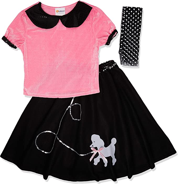 The outfit includes a classic black flannel poodle skirt with sequin trim and a poodle patch. A stretch velour top with black trim and a polka dot scarf top off this delightful outfit that is perfect for theme parties and Halloween night dances as well as the sock hop.