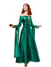 • Long, flowing, off-the-shoulder style emerald dress to ankle length