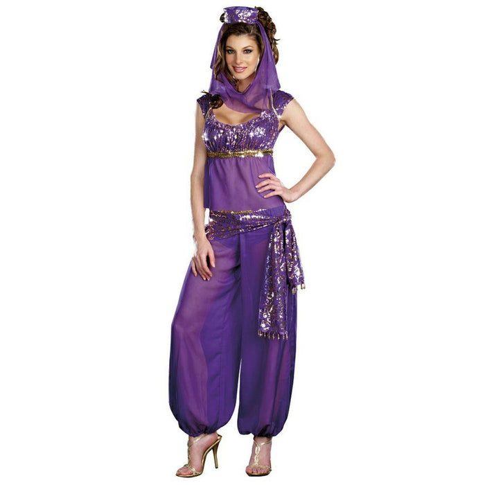 This sexy hottie has a harem of men and won't share 'em! The elegant Ally Kazam costume comes with a chiffon peasant styled top with gold foil paisley print trimmed with gold sequin band. Matching genie pants with gold sequin waistband that have attached stretch shorts inside.