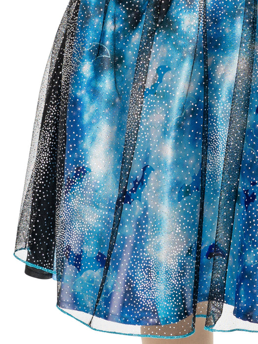 • Glittery double-layered dress with digitally printed bodice, cap sleeves and a tulle peplum feature at the waist. Skirt has glittery effect over a blue and black satin underskirt