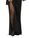 • Long black dress with high side slit and tattered edges at the hem and sleeves