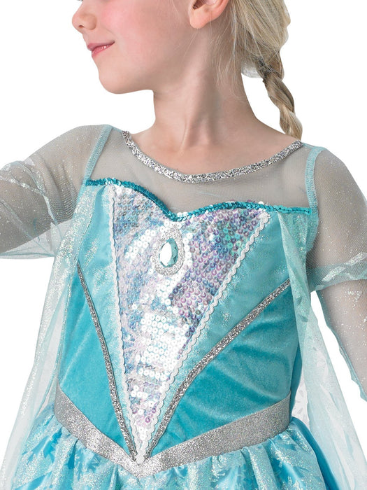 Look fabulous and frozen in Elsa's Snow Queen crystal-blue outfit with delicate sleeves and shimmering, icy prints, ready to whip up enchanted snowmen or perilous blizzards!