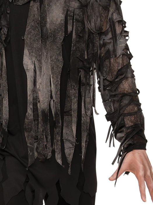 • Hooded shirt with heavy fabric pieces attached and rips and tears throughout