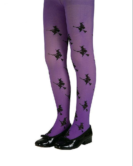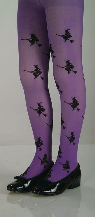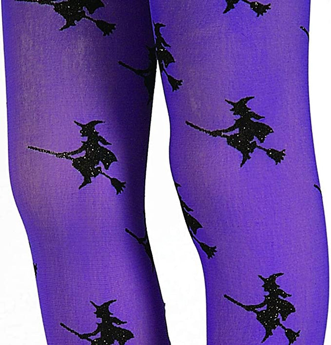 • Glittery purple full-length tights with printed witches riding on a broom stick in black print