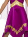 • Purple satin dress with v-shaped hemline and ornate Greek style embellishments in gold including centre waist panel, trim on dress and neckline