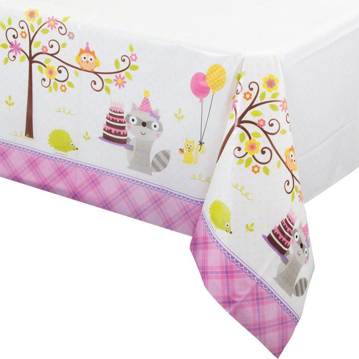 • White Table cover with lightly polka dotted background; sides features birthday scene with woodland friends, accented with pink and purple plaid pattern on border