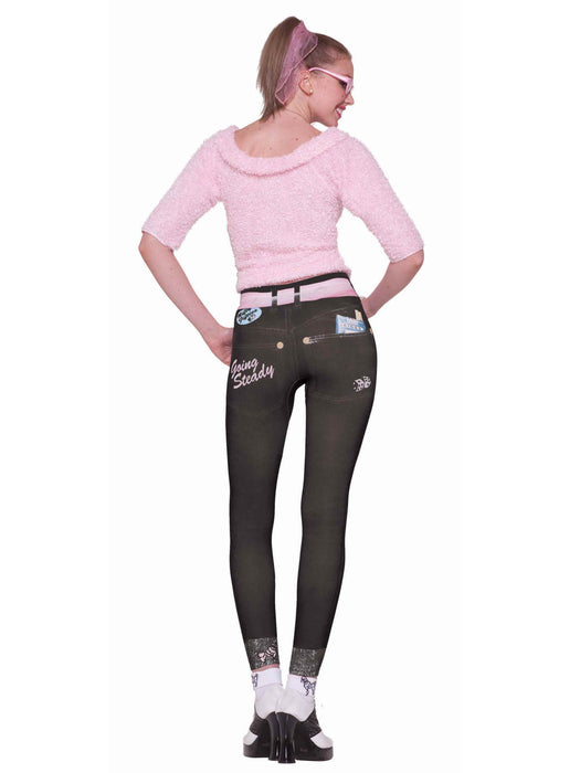 • Jeggings have slogans and logos printed in the rear pockets including the words "Going Steady" and a printed pink belt