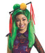• Styled, long green and black character wig with plastic bamboo rod, marigold and ribbon ornamentation