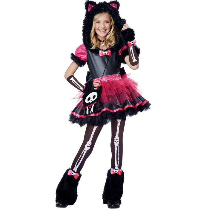Become one of the Skelanimals with this totally awesome Kid's Kit The Kat Costume. The outfit includes a black and red dress with an attached hood, a pair of printed glovelettes, a pair of printed leggings, mitts, leg warmers, a Skelanimals purse, and a choker. The hood features feline ears at the top to make it look like you are, in fact, Kit the Kat. The dress, the leg warmers, and the glovelettes
