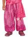 • Genie-styled jumpsuit with glittery pants and elastic at ankles, plus attached torso and intricate collar shape plus capped sleeves. Jumpsuit features attached belt with printed details and side tie