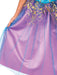 • Purple and blue dress with layered tulle and gold embellishments throughout the bodice plus criss cross gold ribbon and tulle cuffs