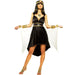 Rule Egypt with an iron fist and a delicate embrace in the Nile Princess Adult Costume. The outfit includes a dress, capelets, cuffs, and a headpiece. The dress is black with a longer back than front that hovers around the knees. The top features two straps that are looped with gold ribbon.