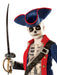 • Printed Captains jacket with red panels and gold buttons, plus mock shirt front with digitally printed skeleton image and cheese cloth overlay. Sleeves with exaggerated cuff and gold button