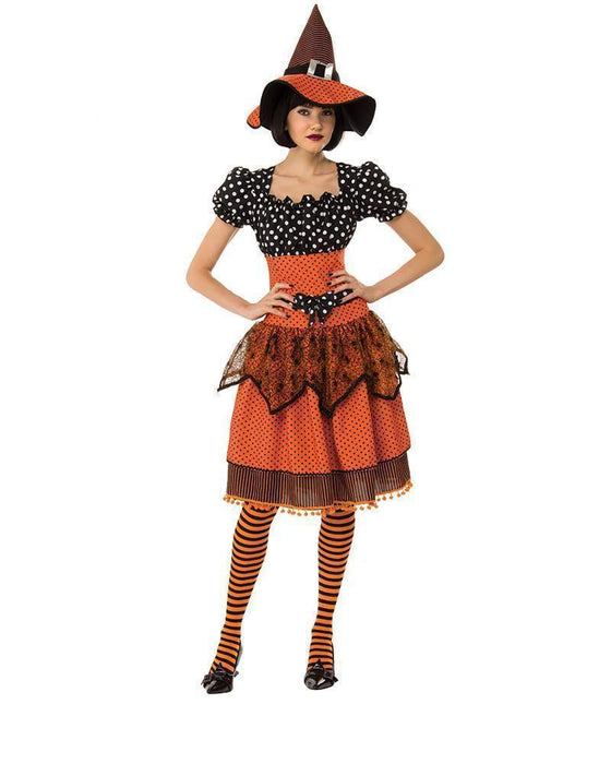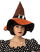 • Pointed witch's hat with printed stripes, wide brim with polka dot print and band with silver buckle