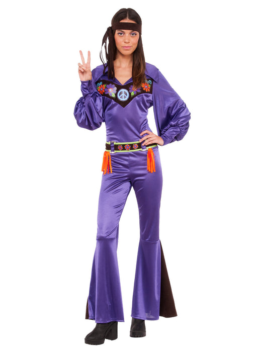 • All-in-one shiny fitted jumpsuit with wide lapels and peace symbol at front