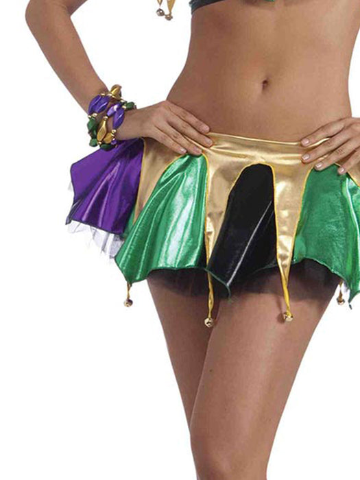 • Matching mini skirt with layered segments and small gold painted bells at pointed ends