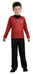 • Red digitally printed long sleeved top with V neck and attached black mock undershirt