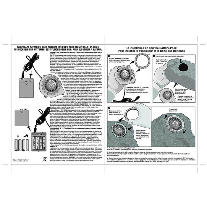 • Battery pack requires 4xAA batteries (not included). Fan sits over right hip within costume