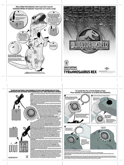 • Battery pack requires 4xAA batteries (not included). Fan sits over right hip within costume. Sound chip for roaring sounds is operated via the glove