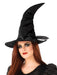 • Witches hat is tall with velour fabric cover and bent peak, plus large tulle bow at front