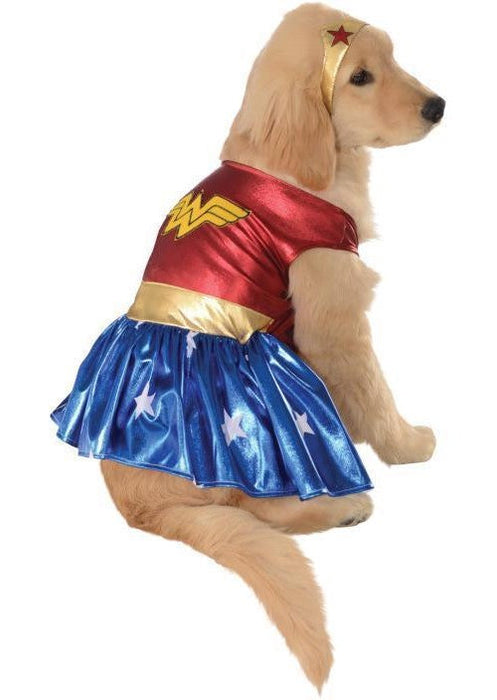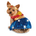 Is your Super-Mutt a Superhero in your eyes? Dress your pooch in this shiny red, gold and blue Wonder Woman costume - and watch her fly!