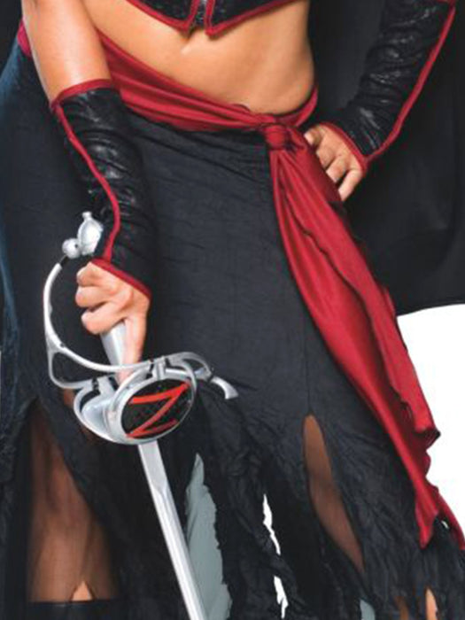• Moulded bustier top with front zipper closure and exposed shoulders and red trim plus skirt with tattered hemline and red sash to tie at waist